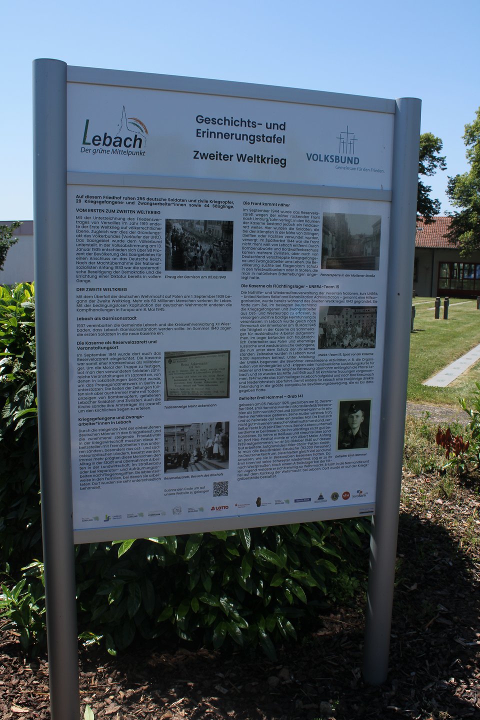 Die neue gut sichtbare, große Geschichts- und Erinnerungstafel am Fuße der Kriegsgräberstätte informiert über Ereignisse der Stadt Lebach im Zweiten Weltkrieg sowie über das Projekt „Lernort Lebach“. Zudem befindet sich nun eine neue Stele am Grab eines Zwangsarbeiters, sodass man vor Ort sein Schicksal nachlesen kann. Bereits seit 2016 läuft das Projekt „Lernort Lebach“, das vom Landesverband Saar des Volksbundes Deutsche Kriegsgräberfürsorge e.V. initiiert und mithilfe von Schulen, Ehrenamtlichen sowie vom Historischen Verein Lebach mitgestaltet und von mehreren Ministerien und Förderern finanziert wurde.