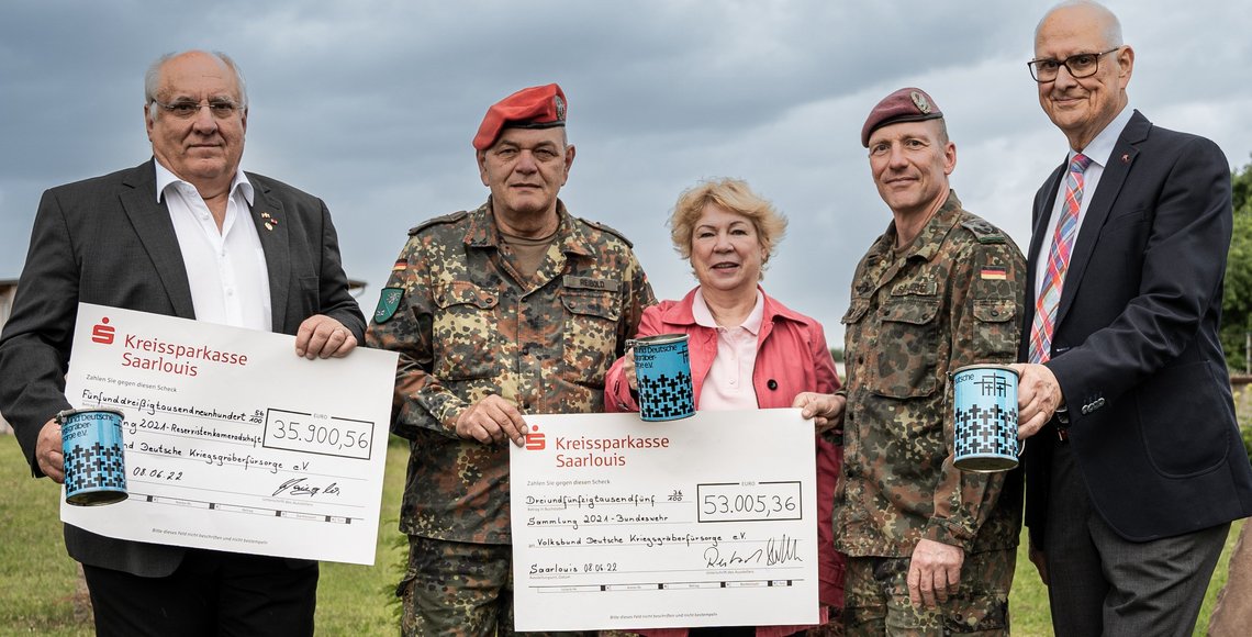 Der Landesverband Saar des Volksbundes führt jedes Jahr im Herbst die Haus- und Straßensammlung im Saarland durch und ist auf die Unterstützung von Bundeswehr, Reservistenkameradschaften, Schulklassen, Vereinen, Verbänden, Feuerwehren und Privatpersonen angewiesen. 2020 fiel die Sammlung pandemie-bedingt kurzfristig aus, und so war es wichtig, dass die letztjährige Spendensammlung wieder stattfinden konnte. Und das Ergebnis ist tatsächlich besser als vor der Pandemie: 2021 wurden 136.635,16 Euro gesammelt; 2019 waren es 128.937,83 Euro. Hiervon haben Bundeswehr und Reservistenkameradschaften insgesamt 88.905,92 Euro gesammelt. Kürzlich fand in der Graf-Werder-Kaserne in Saarlouis eine Scheckübergabe von Bundeswehr und vom Verband der Reservisten der deutschen Bundeswehr (VdRBw) an den Volksbund statt.